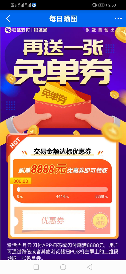 银盛通再送一张免单券活动上线即日起,在新用户注册激活后免费领取50元刷卡抵用券后,又增加一项最新活动内容。如图:使用规则如下:1、客户激活当月云闪付APP扫码或闪付交易金额累计刷满8888元2、用户可通过微信或者其他浏览器扫银盛通POS机主屏上显示的二维码领取一张免单券3、免单券使用限额1000以内4、免单券使用方式包含云闪付APP扫码或闪付有兴趣的朋友可以了解下,详情咨询微信客服7675863,谢谢!