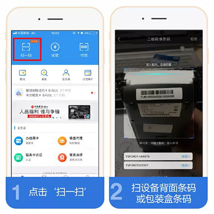 2、扫描银盛通背面条码或者包装盒侧面的条码