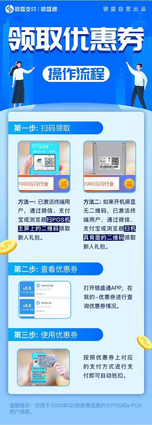 银盛通epos电签版机器怎么参与优惠活动最新版的银盛通epos电签机开机后会出现如下界面,屏幕上会显示一个二维码用微信、支付宝或浏览器扫描机器屏幕二维码会出现如下界面这个活动现在正在测试中,还没有真正实现,后期会有更多优惠活动陆续给到客户,感谢广大客户的支持与喜爱!机器激活后优惠券会直接给到客户,具体领取方式如下图: