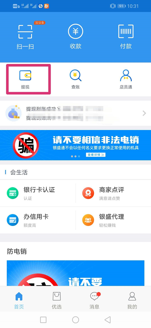 银盛通机器如果刷卡成功但是没有到绑定的储蓄卡里,这种情况直接在银盛通APP里面提现就可以了,具体操作步骤如下图: